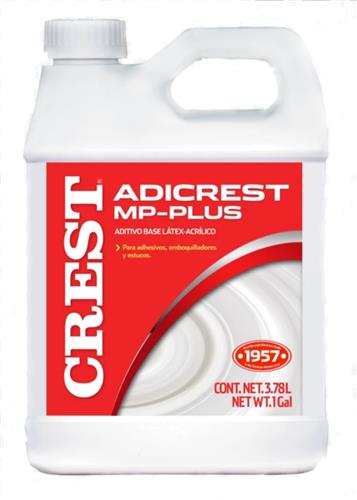 En instalaciones de recubrimientos sobre sustratos tales como: tabla yeso, yeso, piso o azulejo existente, recubrimientos de nula absorción, concreto pulido y en todas las áreas expuestas a la humedad, es recomendable la preparación de los adhesivos CREST con ADICREST MP PLUS. En instalaciones de azulejo o piso, en albercas, fuentes, jacuzzis y cisternas, es importante preparar el adhesivo blanco, la junta o la boquilla con ADICREST MP PLUS en lugar de agua y esperar 14 días para ser utilizado. Para utilizar el ADICREST MP PLUS como sellador de juntas y boquillas, esperar 21 días para un curado adecuado y posteriormente aplicarlo con una brocha y esperar un día para utilizar la instalación