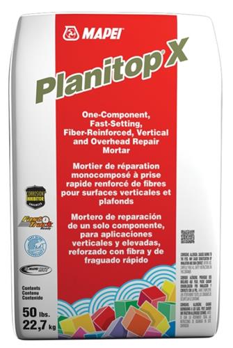 Planitop X es un mortero cementoso de reparación con inhibidor de corrosión, de un componente, reforzado con fibras, de contracción compensada, alta resistencia inicial, fraguado rápido, modificado con polímero y alto espesor.