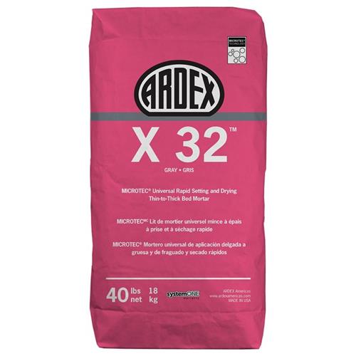 Mortero modificado con polímeros, a base de cementos, fraguado rápido con MICROTEC® y tecnologías de secado rápido, ARDEX X 32™ MICROTEC® Mortero de fraguado y secado rápidos de aplicación delgada a gruesa es ideal para instalaciones de piedra natural sensible a la humedad, mármol y granito. No contribuirá a la formación de manchas, decoloración o deformación de losetas de piedra natural.